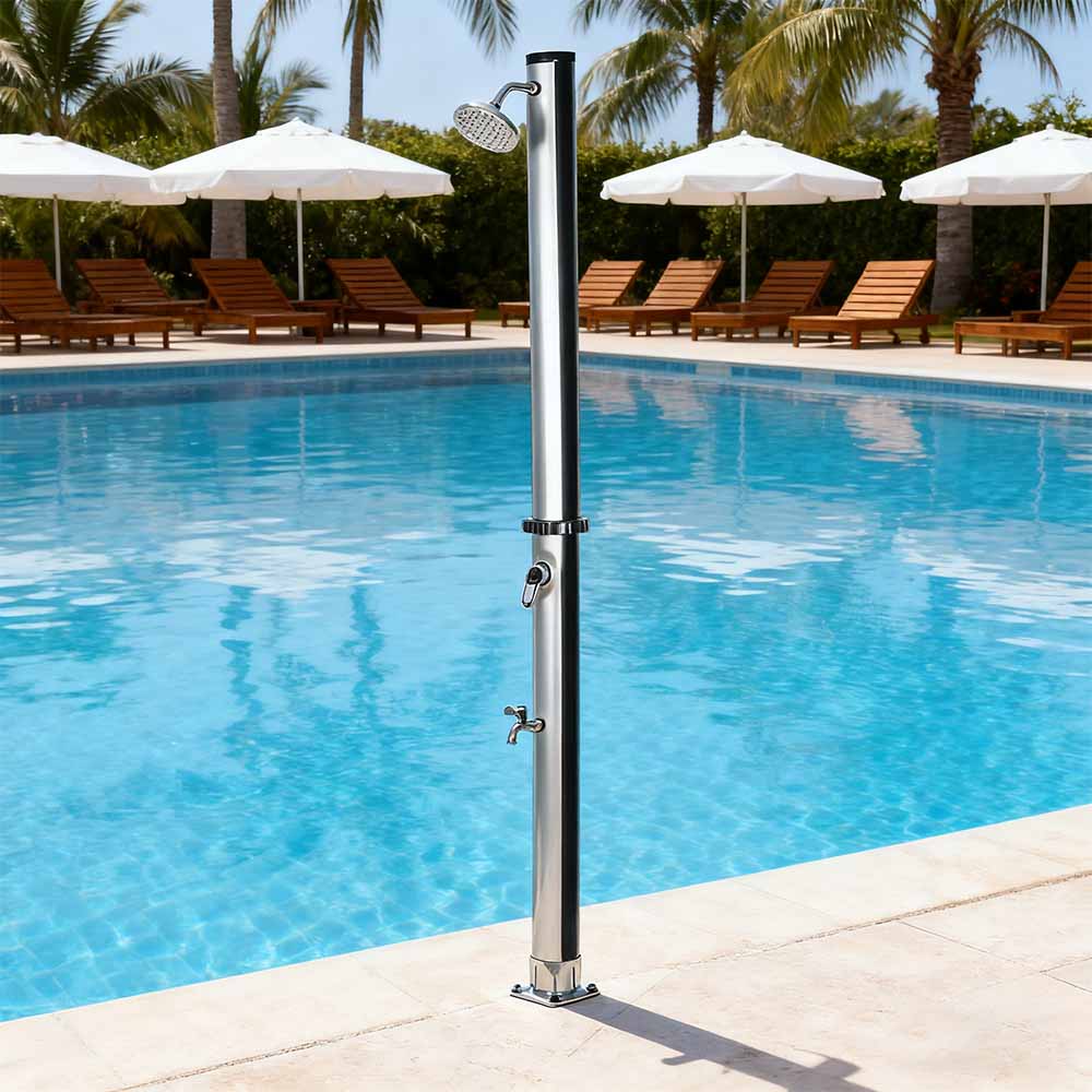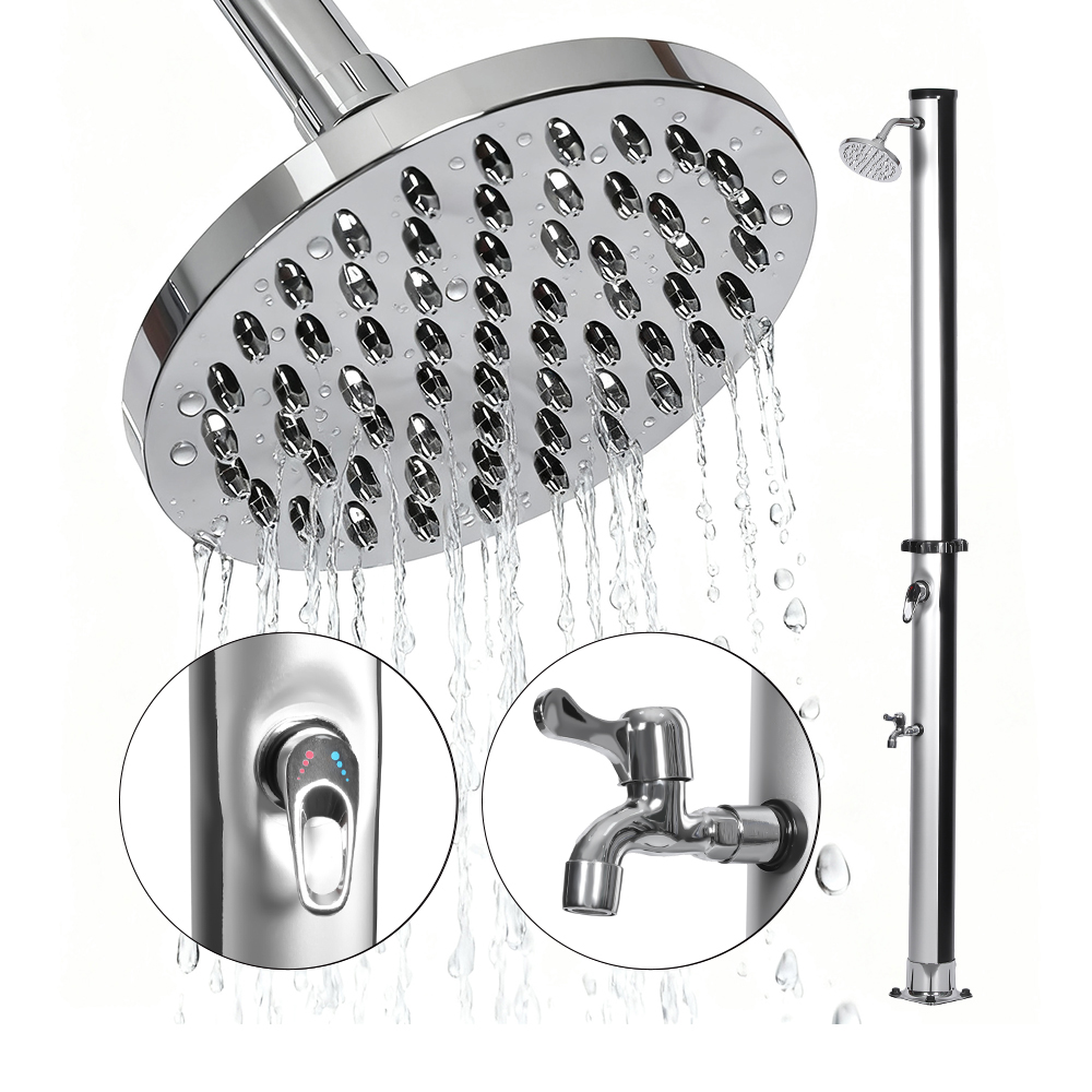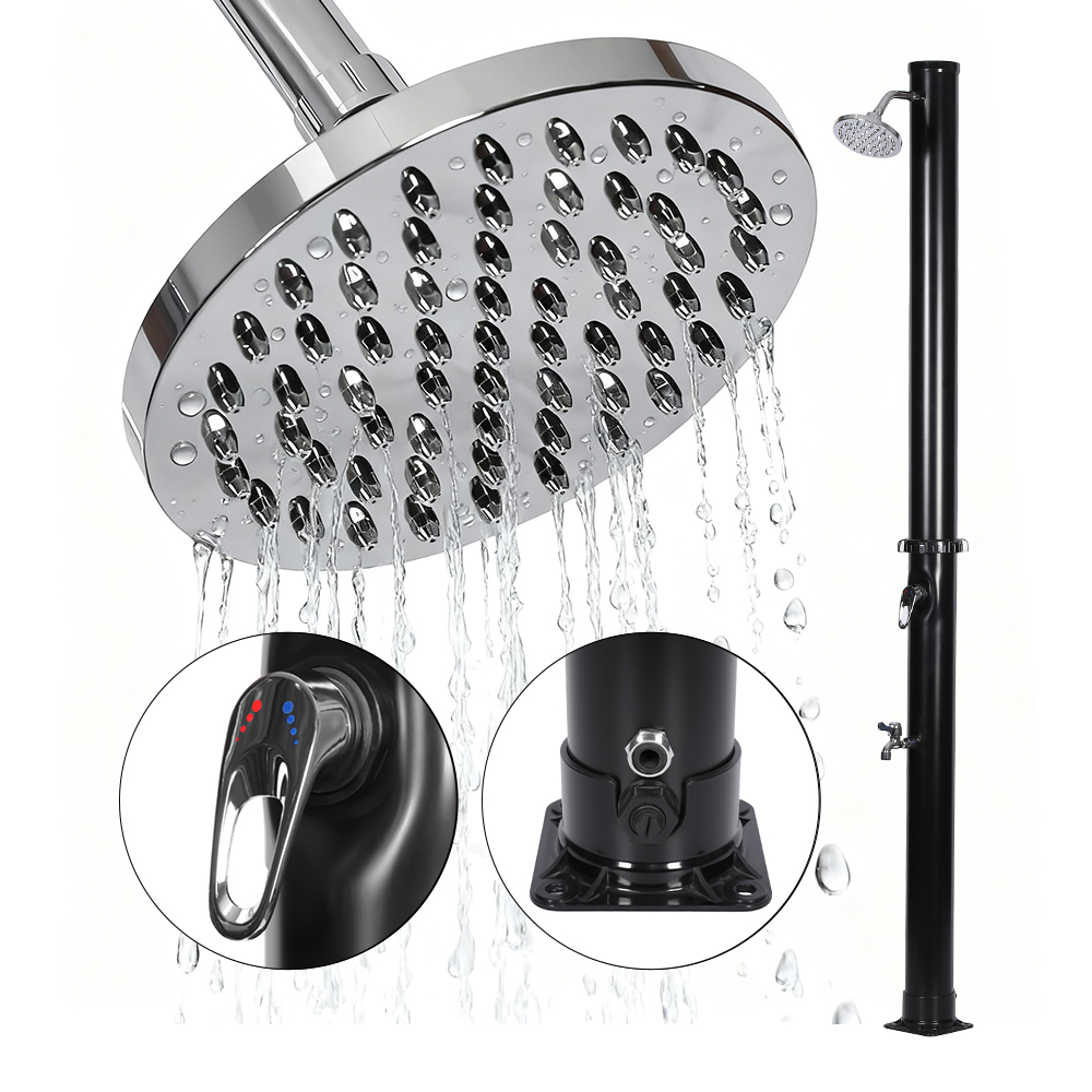 Dizajniran za udobnost na otvorenom, ovaj LY18L01 18L vanjski vrtni pvc solarni tuš stup s bazom idealan je za vrtove, područja uz bazene i kampiranje, predstavljajući jednu od najnovijih inovacija u grijanju vode bez vanjskog unosa energije. Omogućuje jednostavnu kontrolu temperature vode putem miješalice s jednom polugom koja miješa zagrijanu vodu iz cijevi tuša s hladnom vodom iz crijeva, osiguravajući ugodno iskustvo. Izrađen od izdržljive PVC baze za pouzdanu stabilnost i potporu, također ima veliku glavu kišnog tuša s podesivim kutom od 180° putem integriranog kuglastog zgloba, pružajući osvježavajući učinak hlađenja. Postavljanje je brzo i jednostavno, što ga čini praktičnim dodatkom raznim postavkama na otvorenom.